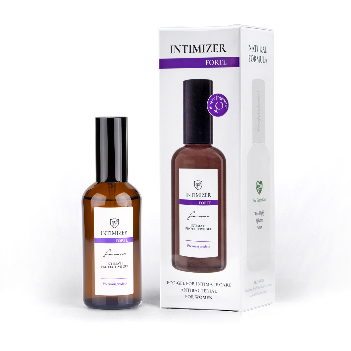 Новое поколение средств для интимной гигиены от бренда INTIMIZER. Богатый натуральный состав - не имеет аналогов по количеству и концентрации активных компонентов! Комплексно выполняет все необходимые функции по поддержанию интимного здоровья и комфорта. Восстанавливает микрофлору. Оказывает длительное освежающее и ухаживающее действия, а также имеет дополнительные терапевтические свойства. Одобрен гинекологами. Эко-гель INTIMIZER на 100% заменяет привычный интимный уход. INTIMIZER FORTE – это усиленная высококонцентрированная формула широкого спектра действия, профессиональная линия средств бренда INTIMIZER.  Более быстрая и надежная защита против широкого спектра патогенных микроорганизмов за счет увеличенной (на 50%) концентрации Smart частиц серебра, 30ppm.  Ускоренное (на 35%) восстановление здорового микробиома интимной зоны и улучшенная профилактика возникновения дисбактериоза за счет комплекса пребиотиков и постбиотиков.  В 2 раза более интенсивный увлажняющий эффект за счет еще одного нового элемента формулы – водосберегающей молекулы Aquaxyl.  Еще больше привлекательности с двойной концентрацией феромона Iso E Super. Идеален для ежедневного применения и в качестве SOS-средства. Наносится и не требует смывания. Обеспечивает длительный комфорт и защиту. Предотвращает воспалительные процессы и инфекции, развитие дисбактериоза и вагинита. Помощь от молочницы. Заживляет микротрещинки, способствует ускоренному восстановлению после родов и операций. Спасает от сухости - увлажняет, питает, поддерживает эластичность и упругость. Деликатно отбеливает и омолаживает, сохраняя интимную эстетику. Гель на водной основе улучшает комфорт романтических отношений. Активные компоненты: Smart частицы серебра; Молочная кислота; Комплекс пребиотиков и постбиотиков (PREBIULIN, INULIN, WORESANA), Д-пантелол; Fucogel, Критмум морской, Hydrovance, Биосахаридная смола, Гидролат календулы; Гидролат Ромашки. Не содержит синтетических отдушек. Имеет чувственный аромат пачули.