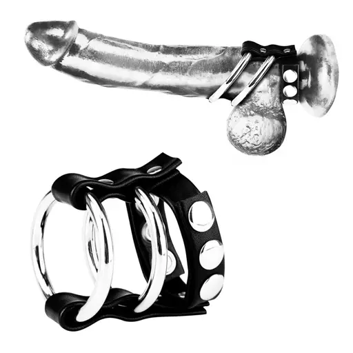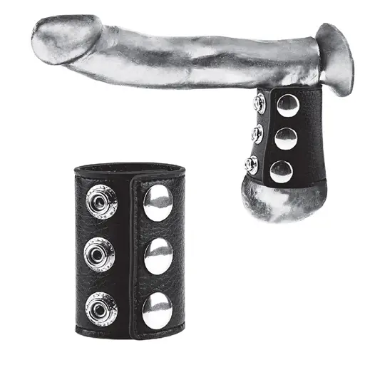 Черное кольцо из качественной экокожи для члена. Кольцо на основание регулируется 3 металлическими клепками, болстретчер для мошонки также имеет 2 ряда клепок для контроля размера, на разделителе для яичек есть петля для пристегивания грузов или других девайсов. Ширина болстретчера 5 см. Максимальный диаметр кольца на член 6,5 см, максимальный диаметр большого кольца на мошонку 4,5. Длина 10 см.